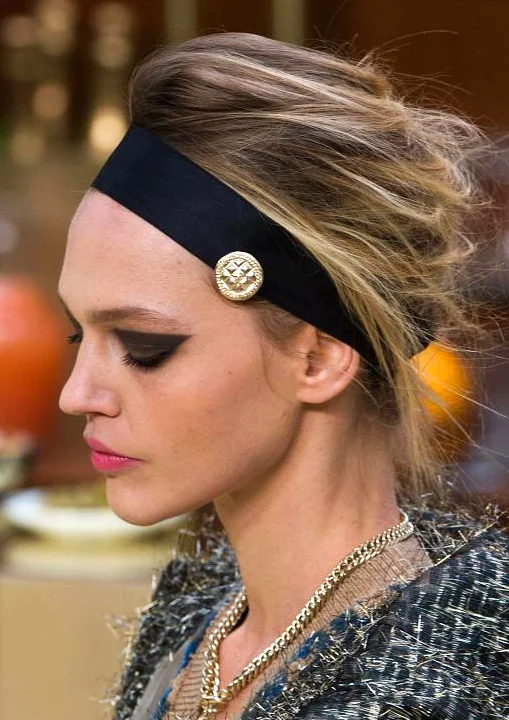 The big black ribbon worn as a headband and a messy updo was seen many times on the runway. Paired with a dramatically lined eye makes for a twenties-era look.